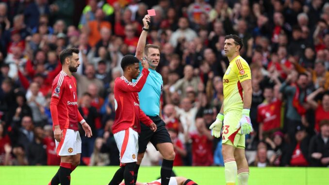 Aston Villa goalkeeper Emiliano Martinez became the first goalkeeper to be sent off in the Premier League this season when he was penalised for pushing Rasmus Hojlund. – The Headlines – Sports News Today, Live Cricket Score, Football News, Sports Videos